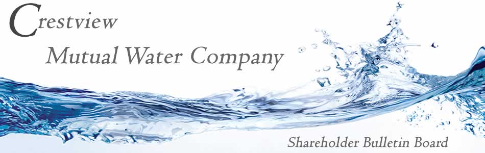 It is imperative that you, and your shareholder neighbors, are aware of and involved in the acts and actions of Crestview Mutual Water Company. After all, it's your water, and you are paying the bills. Visit the new shareholder forum to stay informed, exchange ideas and comments, and get involved.